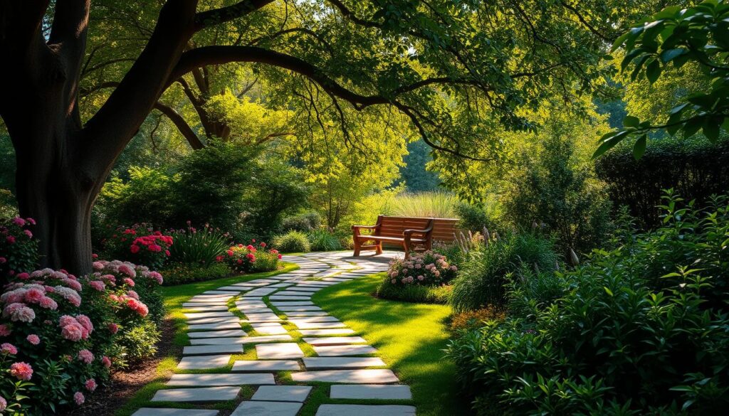 Pathways and seating areas are key in garden design. They help you move around your garden easily and enjoy it. Use natural materials like stone or gravel for your pathways. Add seating areas, like benches or patio sets, to make your garden inviting.